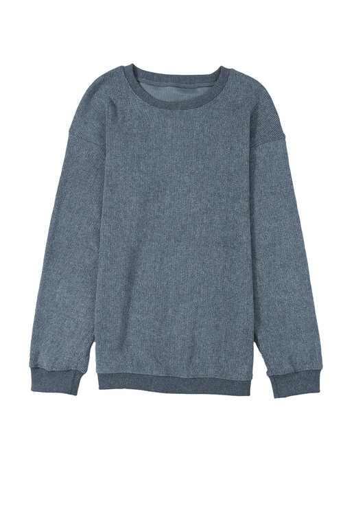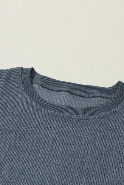 Blue Solid Ribbed Knit Round Neck Pullover Sweatshirt